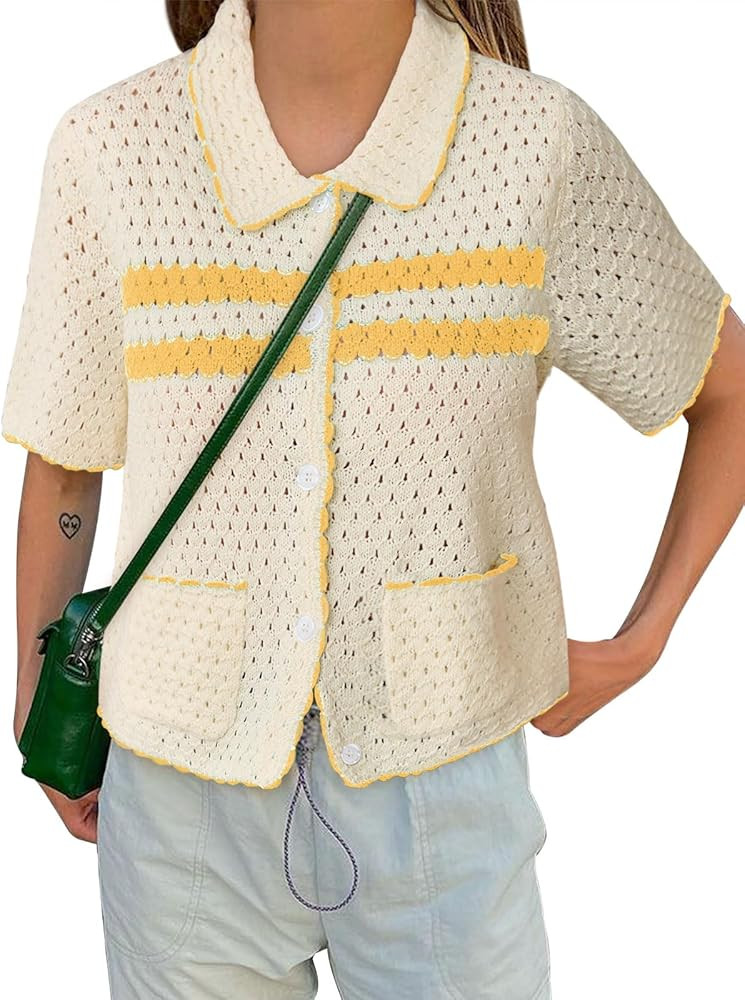 Yousify Womens Striped Short Sleeve Sweater Casual Knitted Button Down Crochet Cardigan Vintage Y...