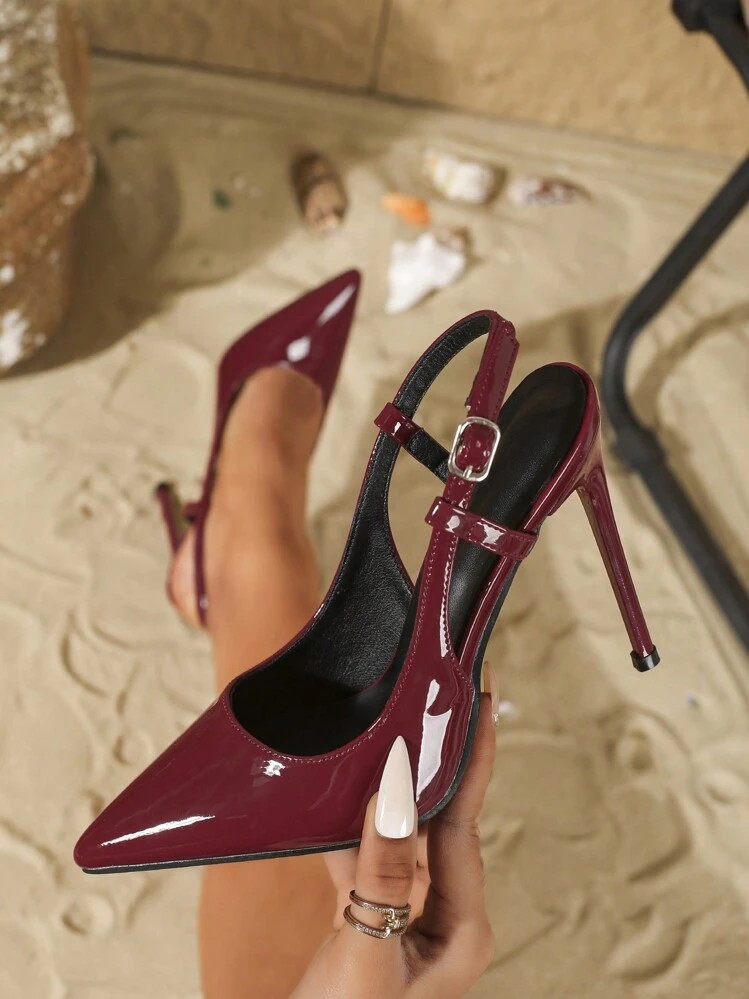 Fall/Winter 2025 11cm Pointed Toe High Heel Women's Shoes, Elegant Slim Stilettos With Ankle Strap, Mirror PU Material Wine Red Color, Suitable For Daily/Party Wear, Elegant, Women Pumps,Elegant