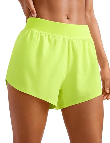 CRZ YOGA Mid Waisted Split Running Shorts for Women 4" - Comfy Mesh Liner for Workout Athletic Gym Track Quick Dry Neon Yellow Large