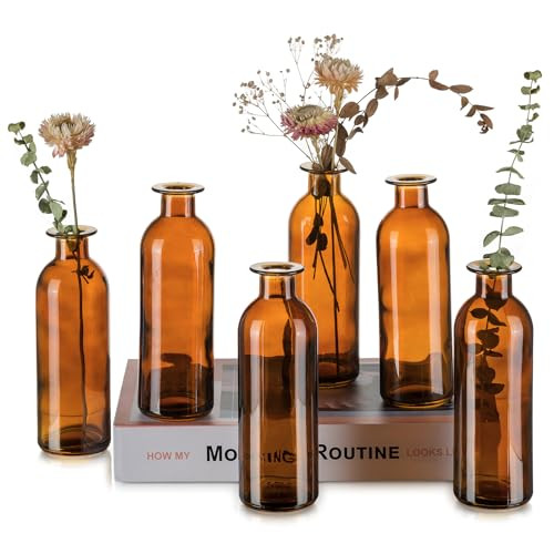 Amber Glass Bud Vases for Flowers - Hewory 6pcs Brown Vintage Small Glass Vase for Centerpieces, Tall Decorative Apothecary Bottles Bulk Boho Table Decor for Wedding Party Events Floral Arrangements