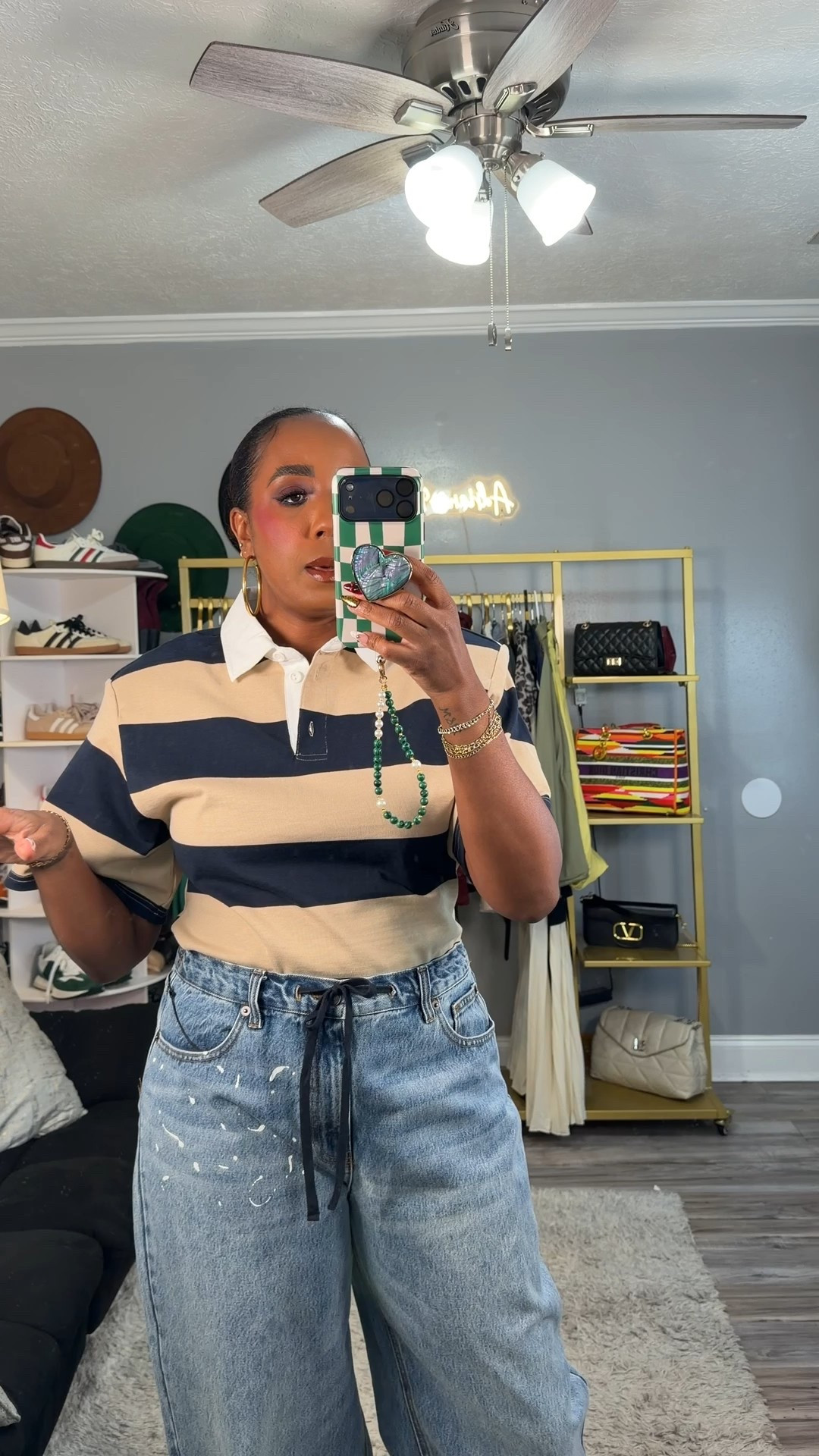 Striped button down + wide leg pants styled comfy but polished. Perfect for running errands, brunch, or casual work days when you still want to look put together.