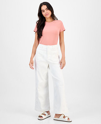 Petite Eyelet-Embroidered Wide Leg Jeans, Exclusively at Macy's