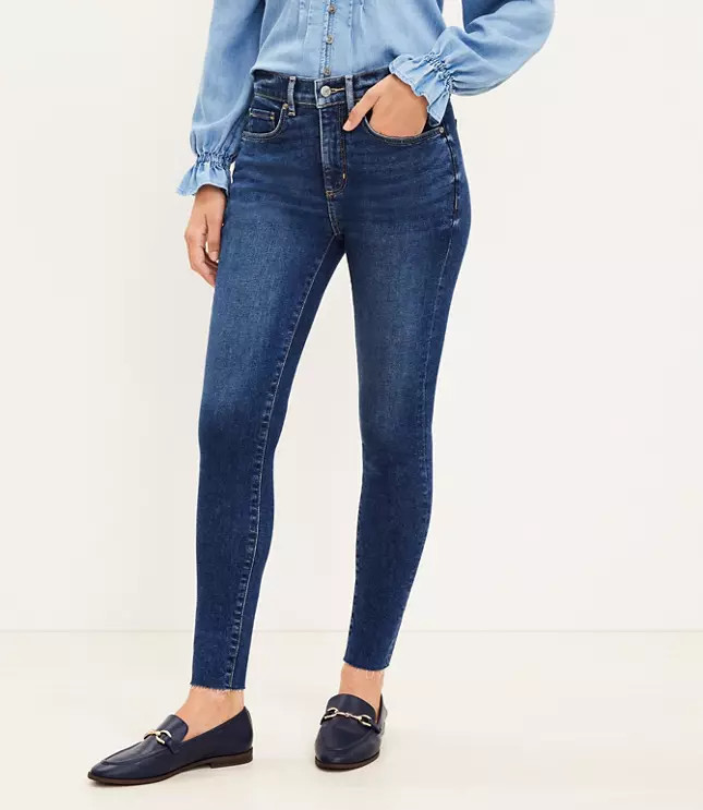 Chewed Hem Mid Rise Skinny Jeans in Authentic Mid Indigo Wash