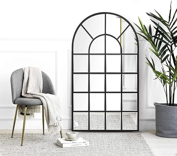 Black Arched Window Mirror, Large Window Pane Mirror with Beveled, Metal Framed Windowpane Mirror...