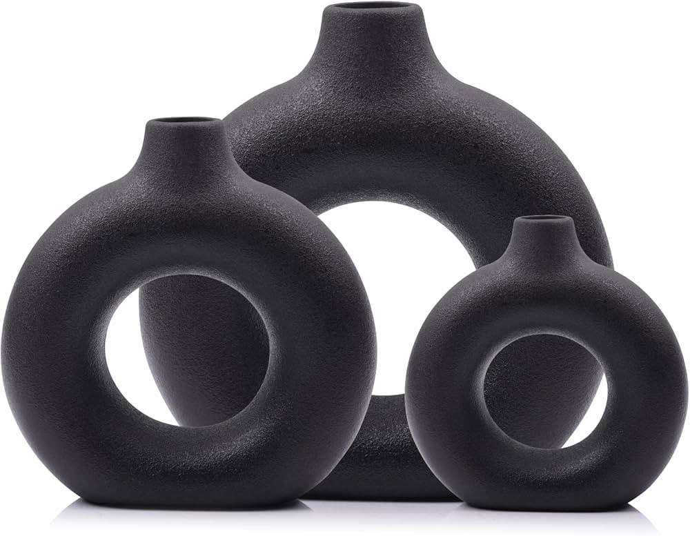 Matte Black Ceramic Vase Set 3 - Donut Circle Hollow Vase Entryway Decor Ideas, Black Boho Pampas...