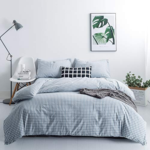 SUSYBAO Light Blue Gingham Duvet Cover Queen 100% Washed Cotton Blue Plaid Duvet Cover Set 3 Pieces 1 Blue Grid Duvet Cover with Zipper Ties 2 Pillow Cases Luxury Gingham Plaid Bedding Set Breathable