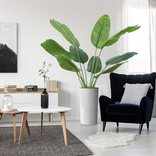 Artificial Tree in White Marble Effect Planter, Fake Banana Leaf Silk Tree for Indoor and Outdoor Home Decoration - 66" Overall Tall (Plant Pot Plus Tree)