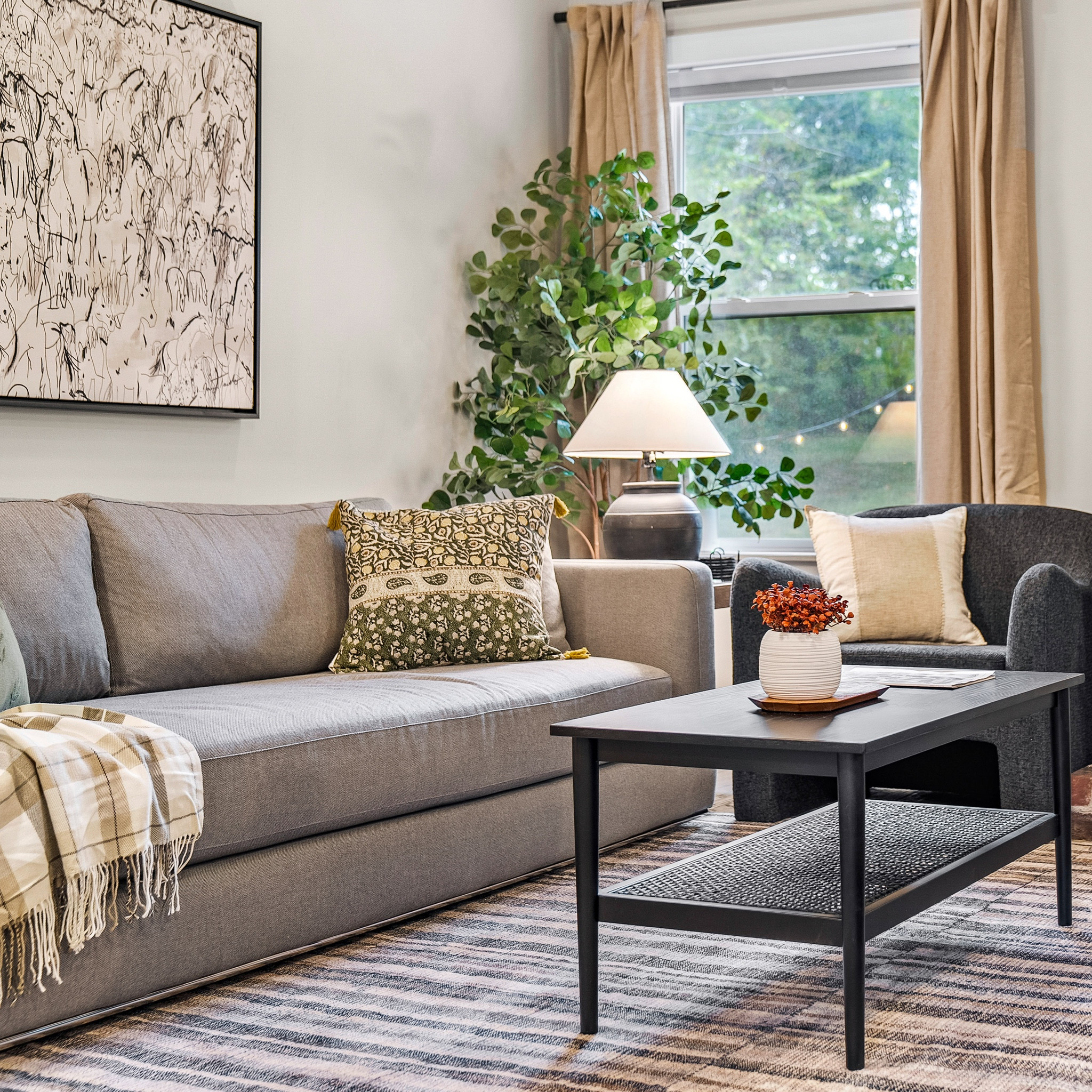 Fall home refresh! Plaid, velvet and lots of texture! Art and curtains are the easiest way to change up your home seasonally.