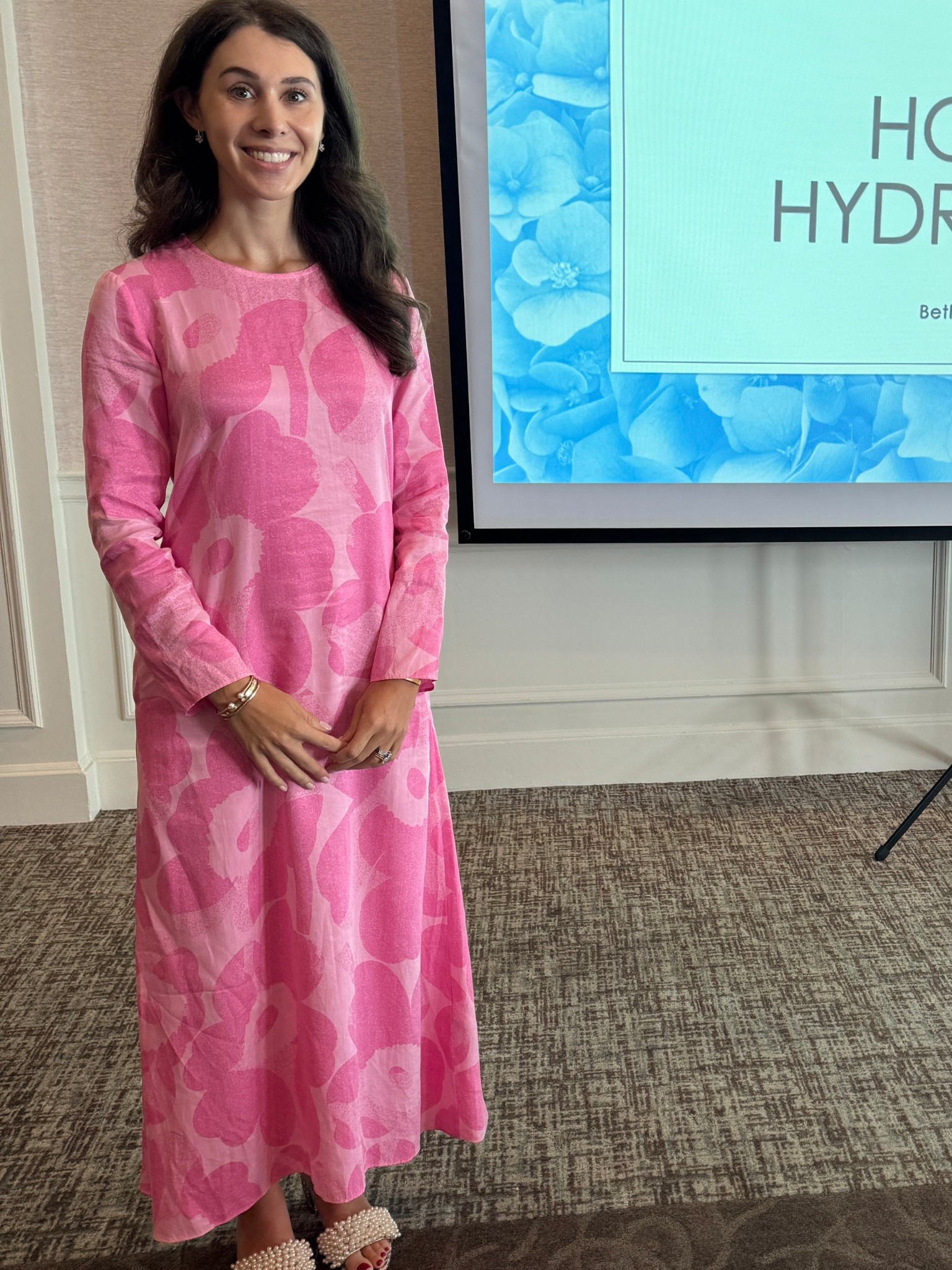 Wearing an XS in this fun garden print dress