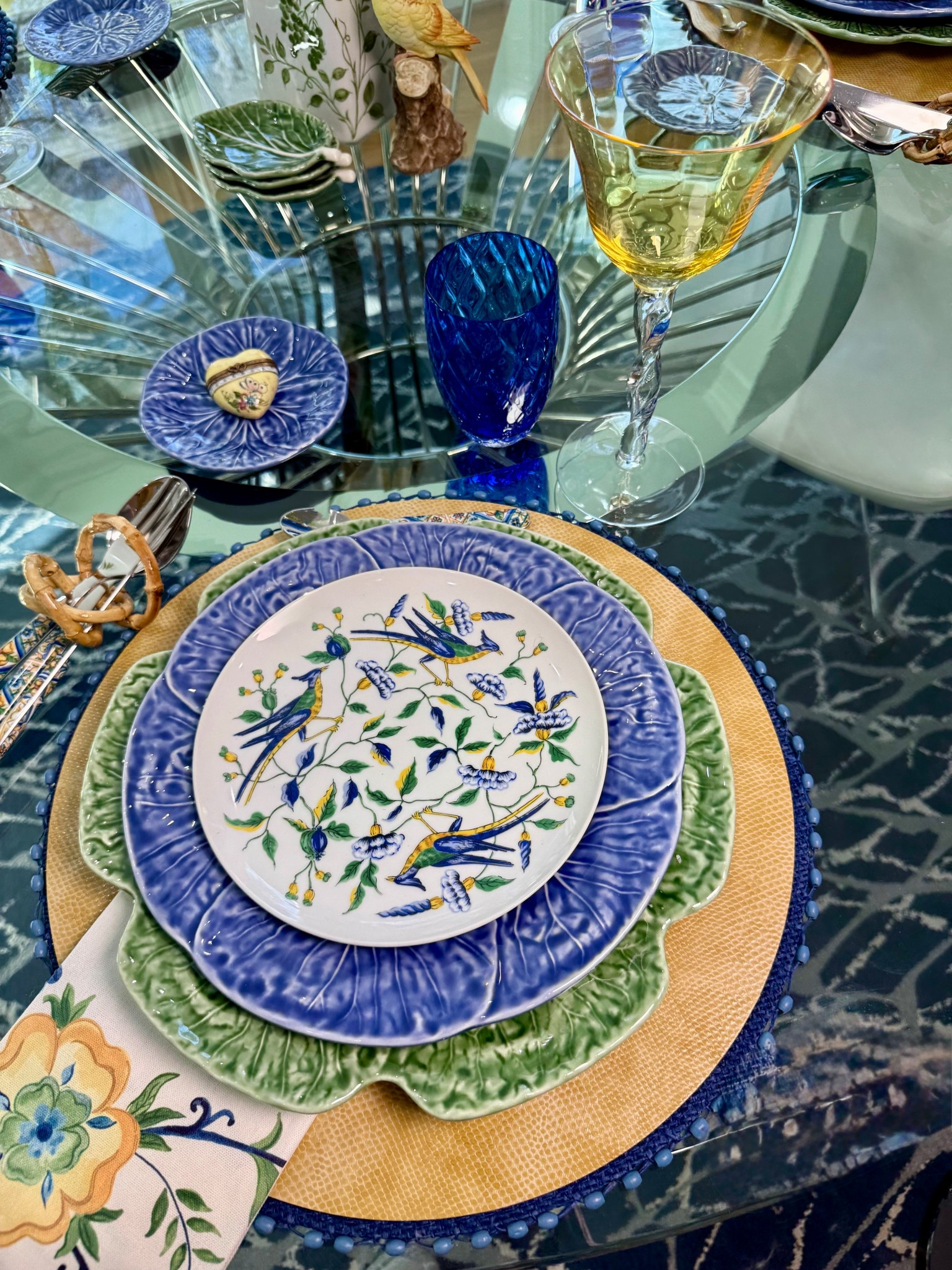 Add some tortoise touches to blue blues for transitional table towards Fall.