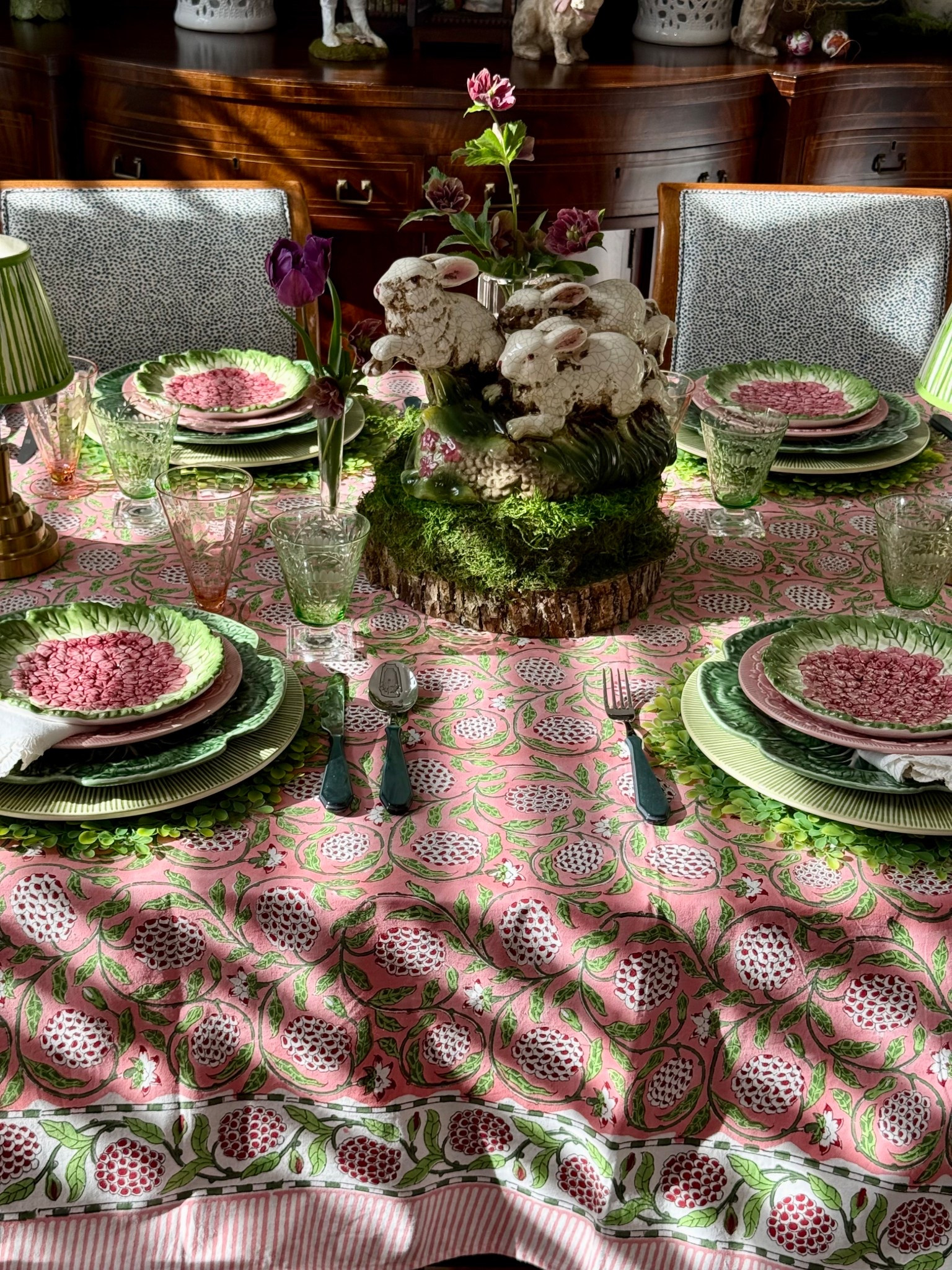 Whimsical Table setting, Lily pads and frogs,pinks and greens on beautiful hand blocked tablecloth.Depression pink glassware ,the perfect color