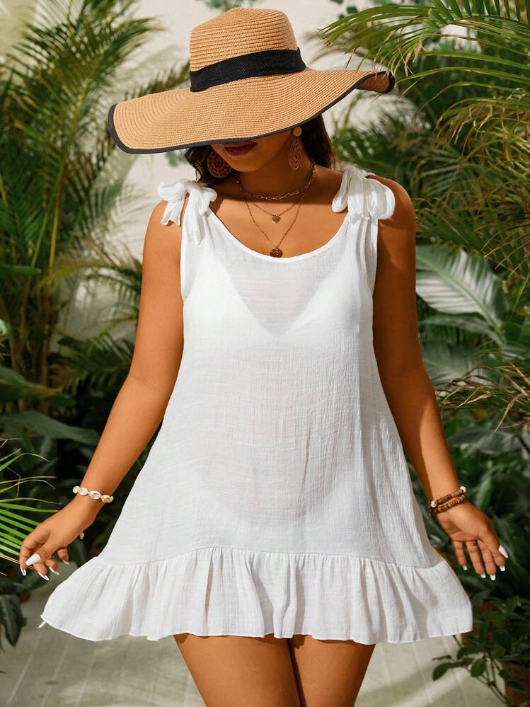 SHEIN Swim Curve Summer Beach Plus Size Solid Color Shoulder Knot Ruffle Hem Sheer Cover Up Dress