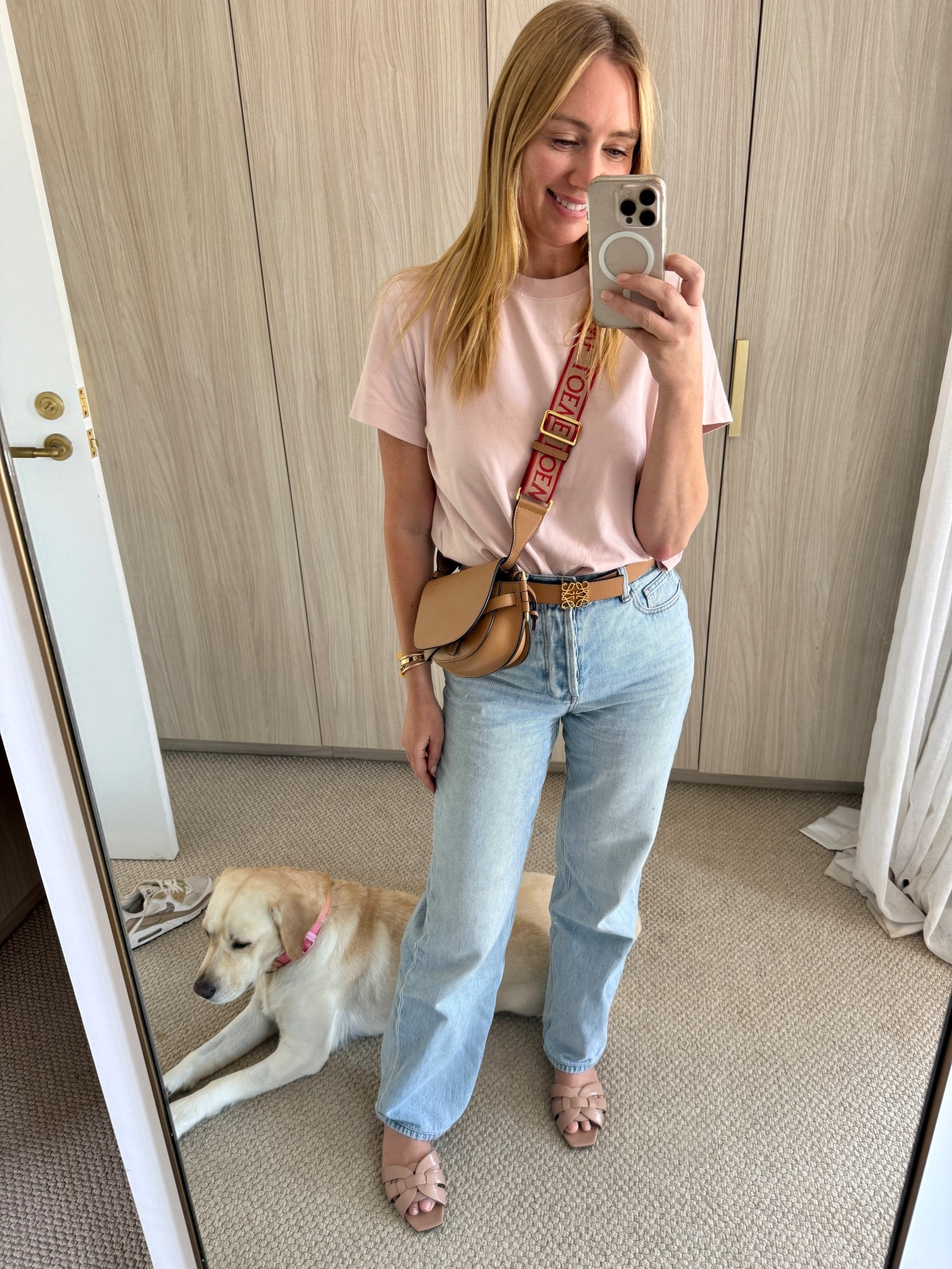 Always a Labrador photo bombing my #ootd shots πŸ“Έ- Wearing Jag jeans and jag knit top. Shoes YSL tribute slides. Bag not show, but pink Chanel.