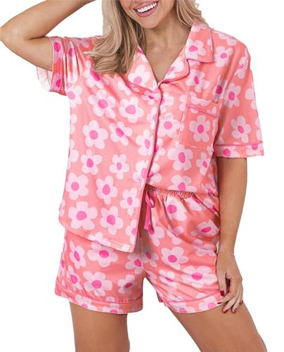 KevaMolly Womens Pajama Sets Pink Flower Print Buttoned Drawstring Waist Lounge Set Short Sleeve Top and Shorts M