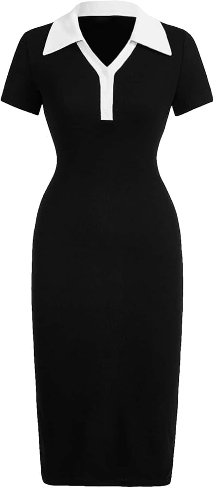 GORGLITTER Women's Color Block Button Down Bodycon Midi Dress Collar Short Sleeve T Shirt Dresses