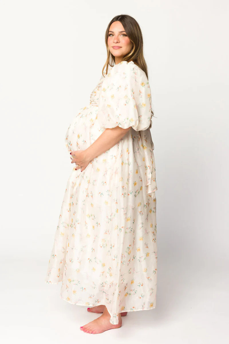 Melody Maxi Dress with Pleats and Bow Detail in Yellow Rose Floral - B