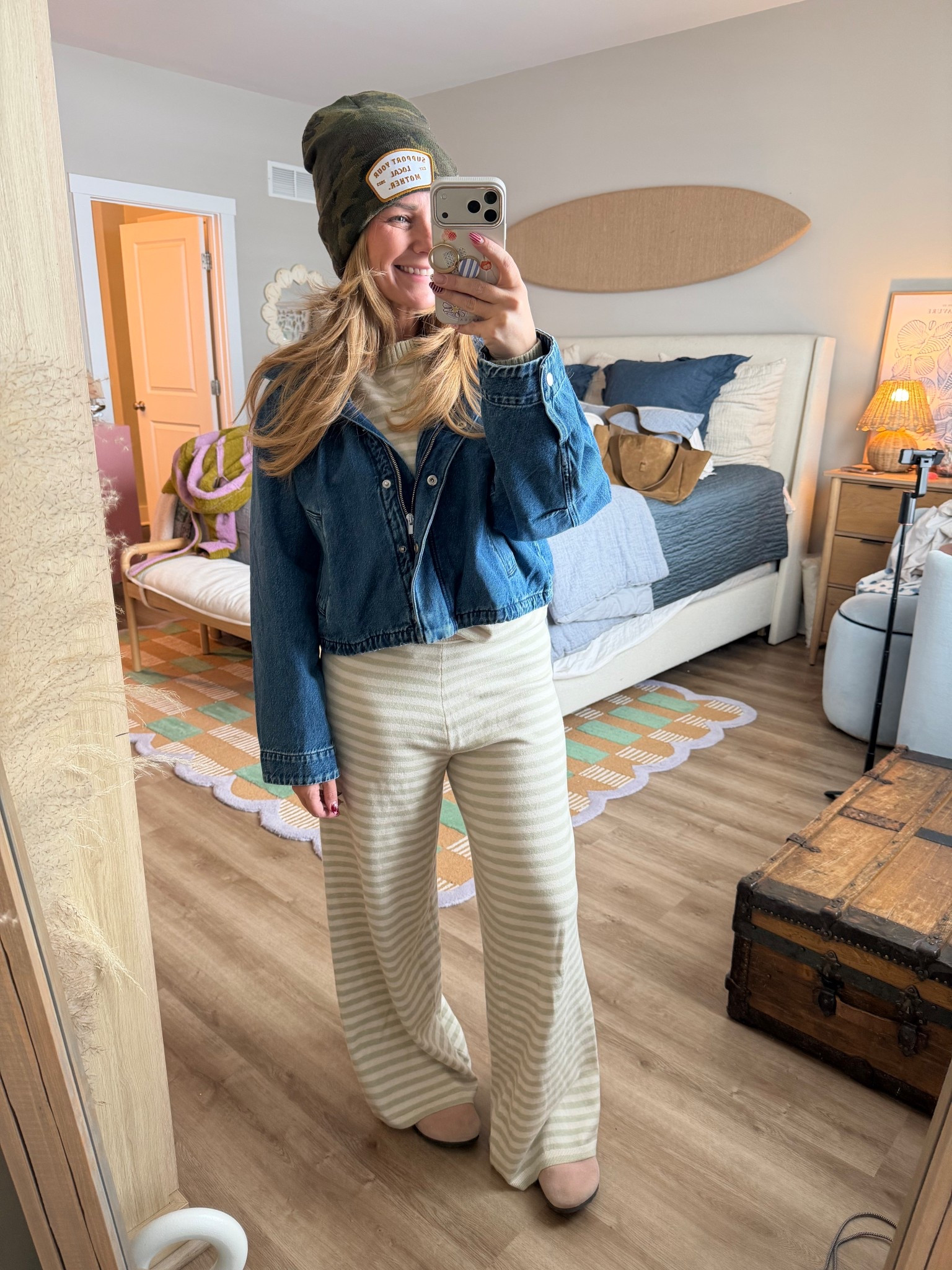 ✨ Flattering fit: high waisted denim, wide leg silhouette, cropped jacket balance