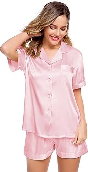 LecGee Womens Silk Satin Pajamas Short Sleeve Loungewear Two-Piece Sleepwear Button-Down Pj Set
