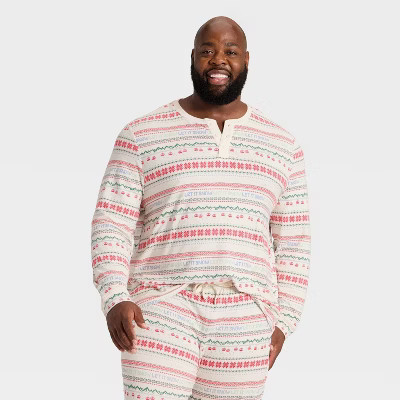 Men’s Big & Tall Fair Isle Cozy Knit Long Sleeve Henley Holiday Matching Family Pajama Shirt - Wondershop™ Cream 5XLT