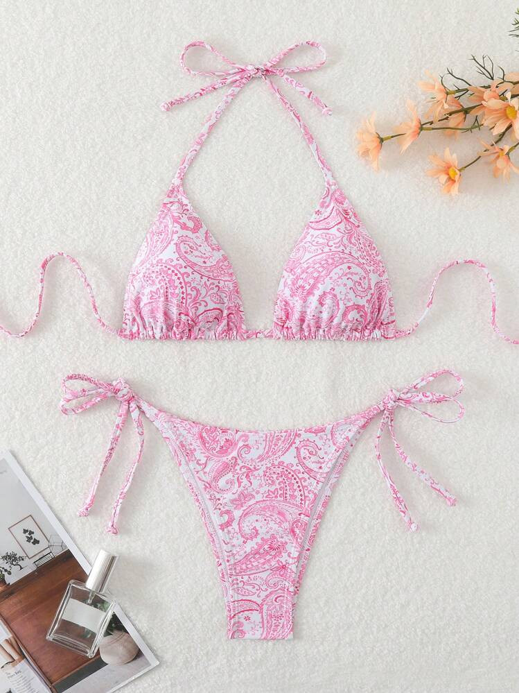 SHEIN Swim Ladies Summer Beach Paisley Printed Pink Halter Neck Tie Sexy Bikini Set, Random Print