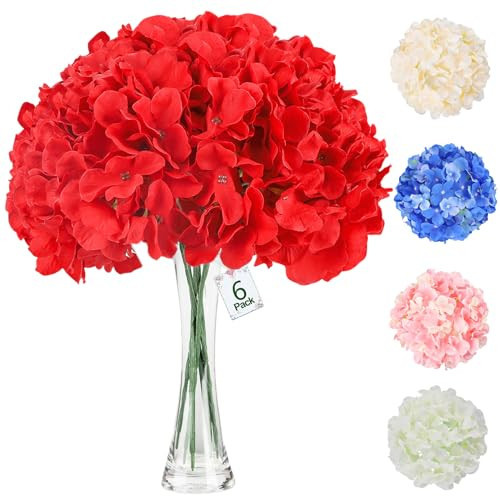 AWARDSEN 6Pcs Red Hydrangea Artificial Flowers Fake Hydrangea Real Touch Faux Flowers Hydrangeas with Long Stem for Home Party Wedding Centerpieces Bouquets Decor