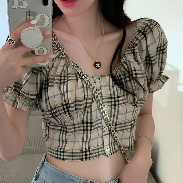 Maisee - Puff Short-Sleeve Button-Up Plaid Cropped Blouse
