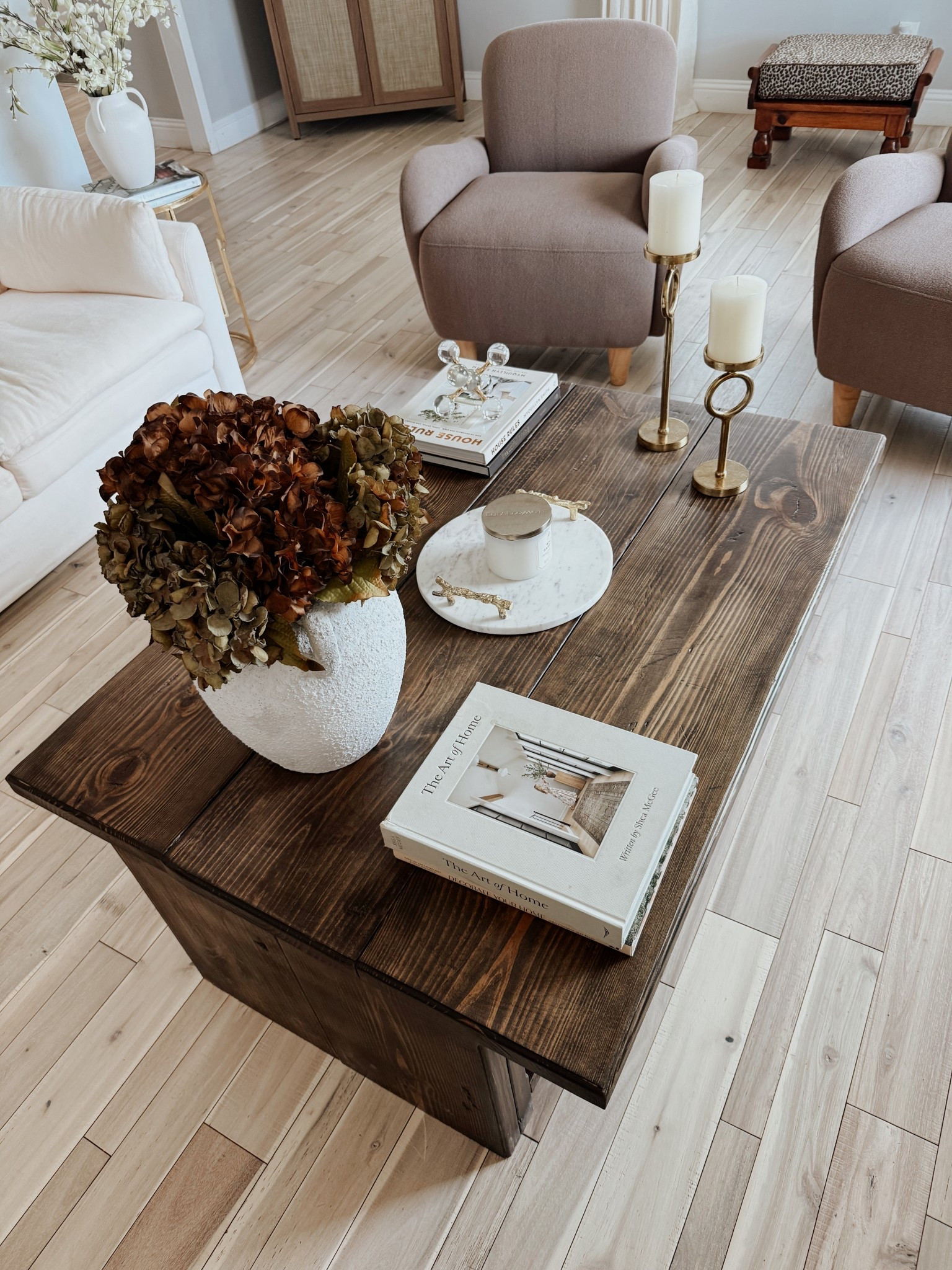 Neutral tones, warm textures, and a touch of dried florals to make the living room feel cozy yet elegant. I love how the natural wood and soft beige palette create a clean look with so much personality.