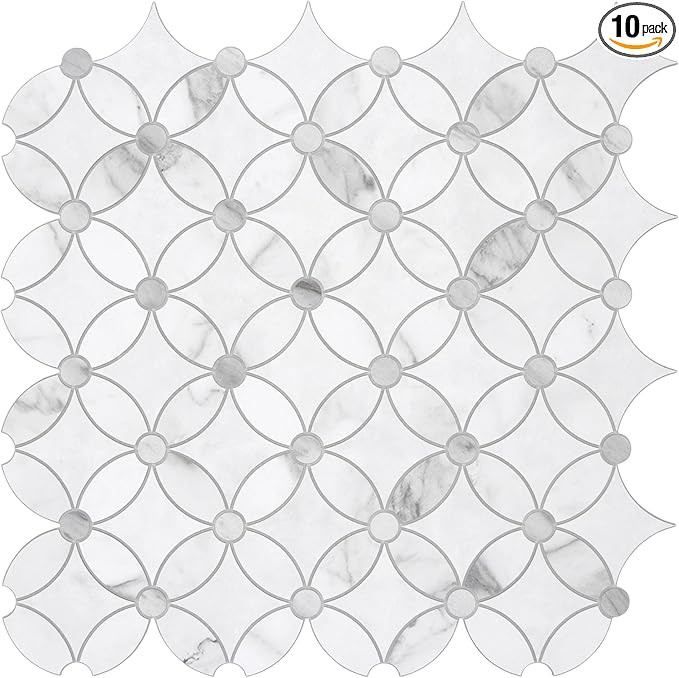 SUNWINGS 10-Sheet Coin Peel and Stick Waterjet Backsplash Self Adhesive Tiles White Marble Wall P...