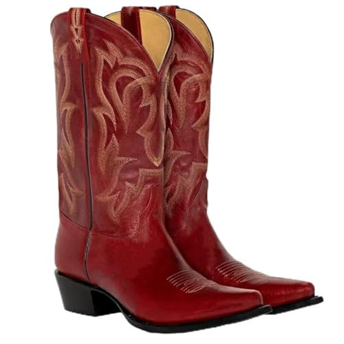 LISHAN Women's Western Boots Cowboy Cowgirl Boots Pull On Embroidered Chunky Block Heel Comfortable Mid Calf Under the Knee High PU Boot Small Square Toe Country Western Party Shoes Red Size 10
