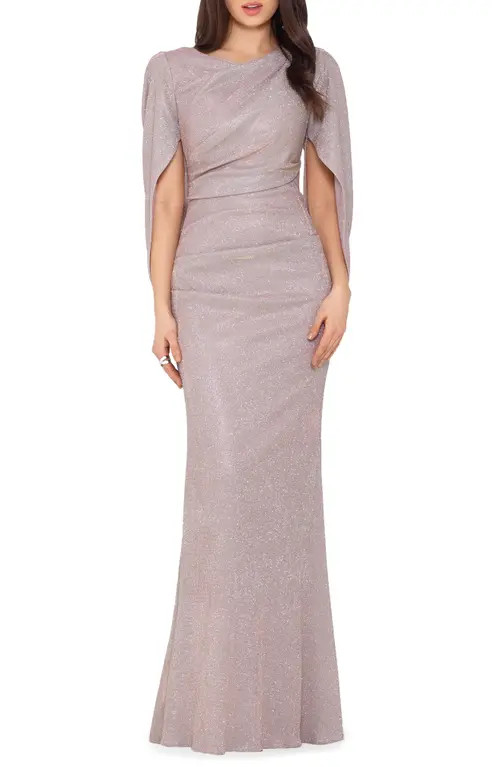 Betsy & Adam Cape Sleeve Trumpet Gown in White/Pink/Gold at Nordstrom, Size 14P