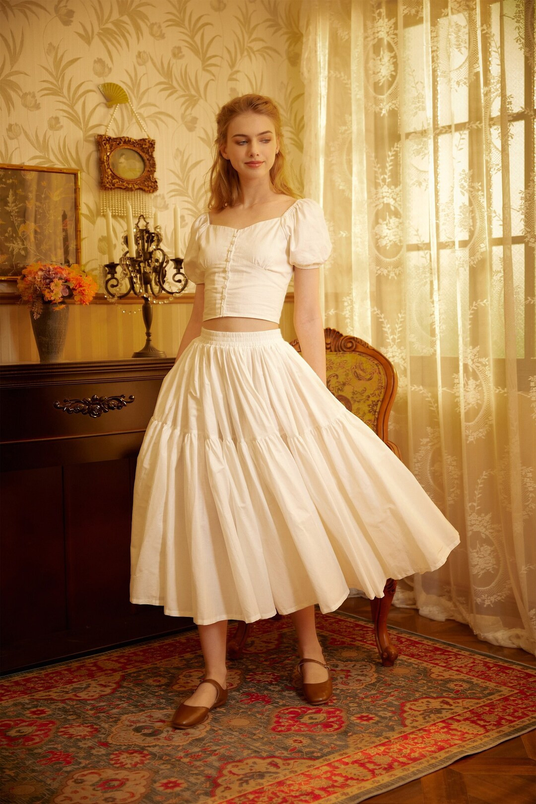 Maxifalda con bolsillos escalonados Falda blanca de algodón Falda larga plisada estilo bohemio C...