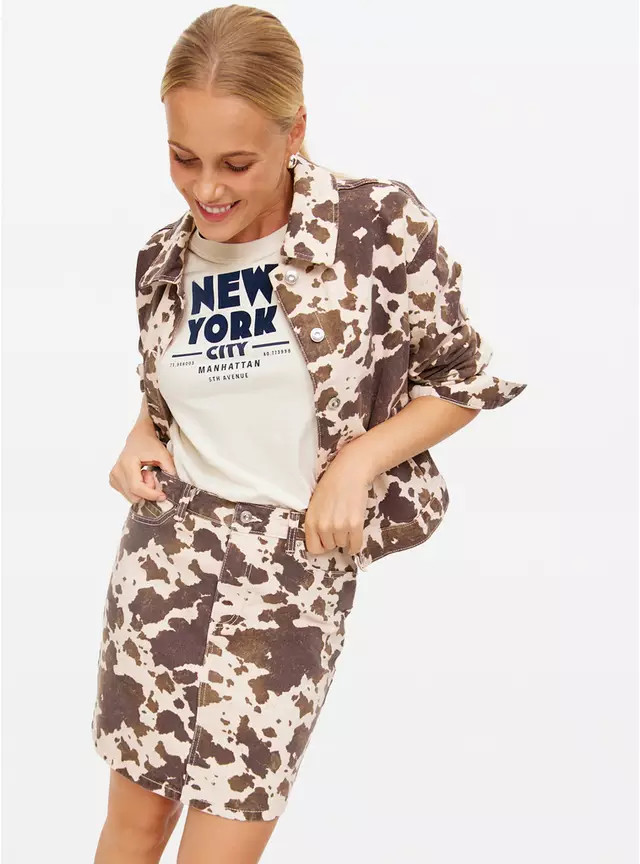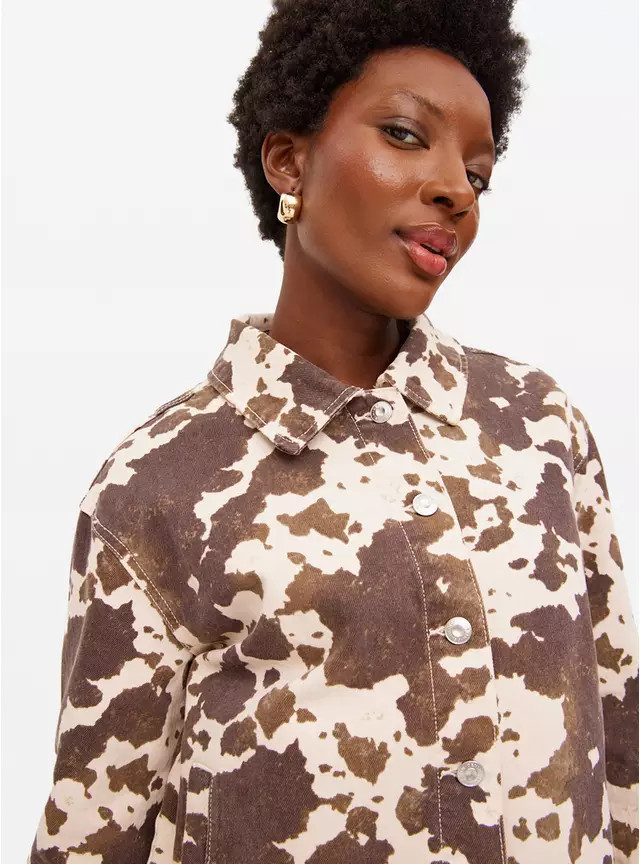 Autumn clothing, jackets, barn jacket, suede jacket, cow print, mini skirt, denim, loafers