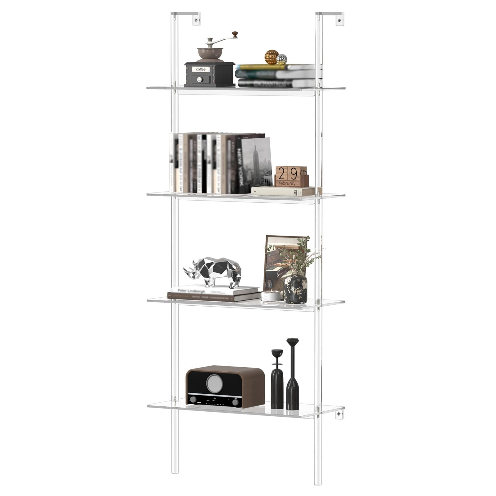 Acrylic Ladder Bookshelf, 4-Tier Clear Wall Mounted Bookshelf with Open Shelves, Multipurpose Boo...