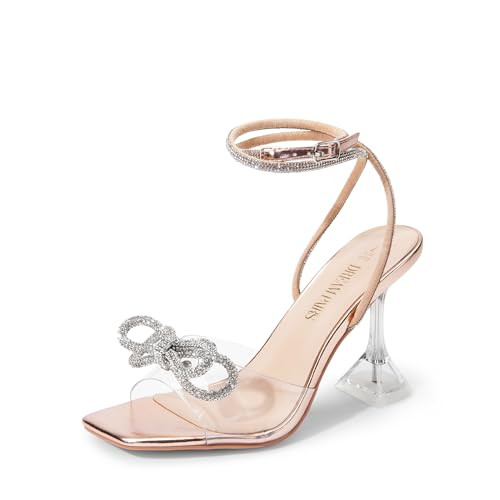 DREAM PAIRS Stiletto Bow Heels for Women Strappy Sparkly Rhinestone Square Toe Clear Crystal High Sandals for Party Wedding,Size 6.5,Rose Gold-Pu,SDHS2481W