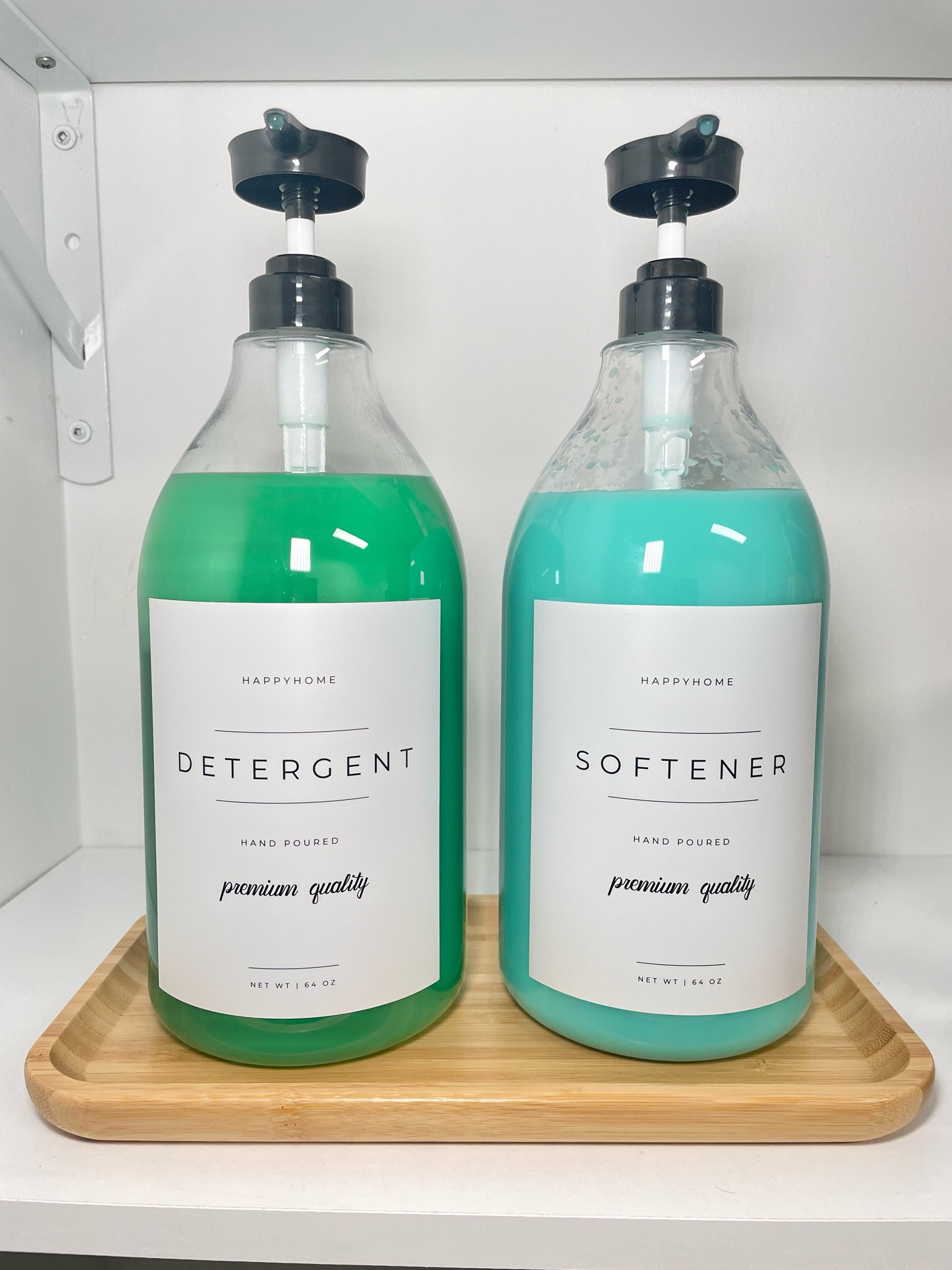 We love a blank slate and this project was no exception. This space had little storage so we created some by installing shelves. The decorative laundry decanters were just the icing on the cake!