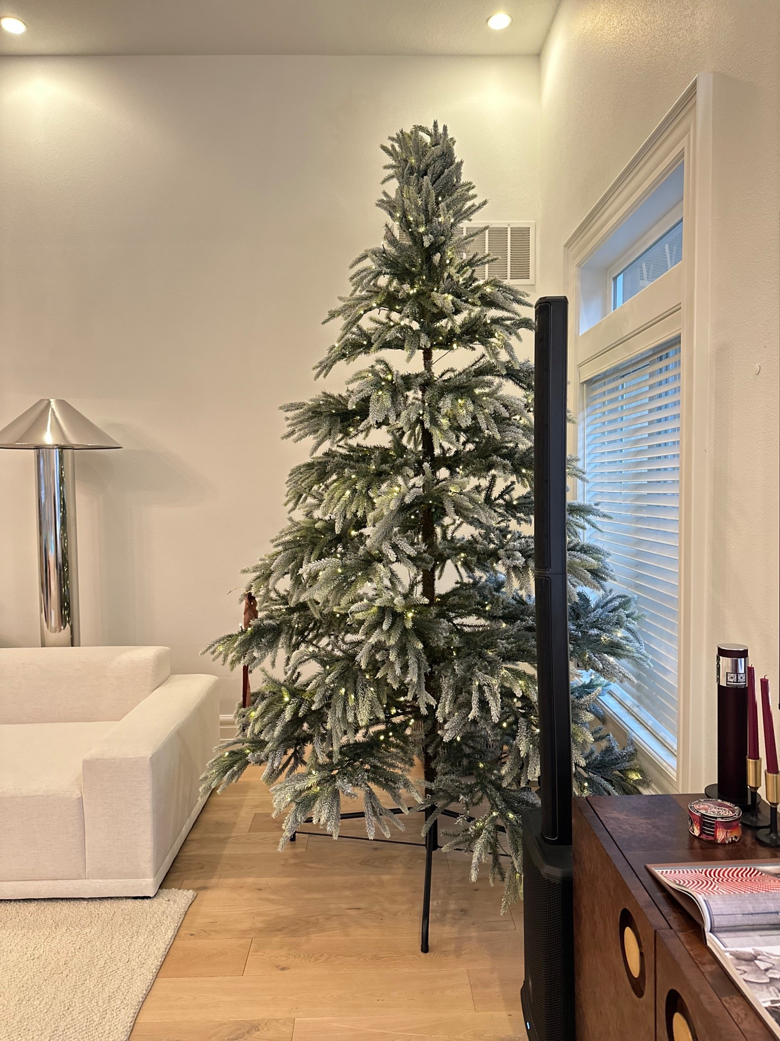 Faux Downswept Flocked Pine Pre-Lit LED Christmas Tree with Warm White Lights 9' | CB2 | CB2