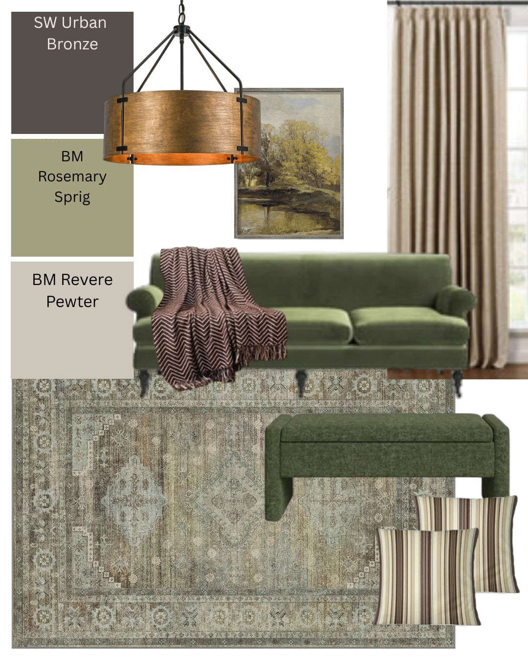 Here's a mood board specifically worked around Sherwin-Williams Evergreen Fog. 🌿