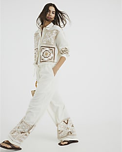 Cream Linen Blend Patchwork Broderie Trousers