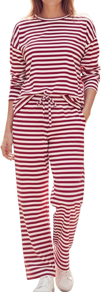 2PCS Womens Striped Loungewear Set Long Sleeve Tee Shirts Drawstring Wide Leg Pants Matching Loun...