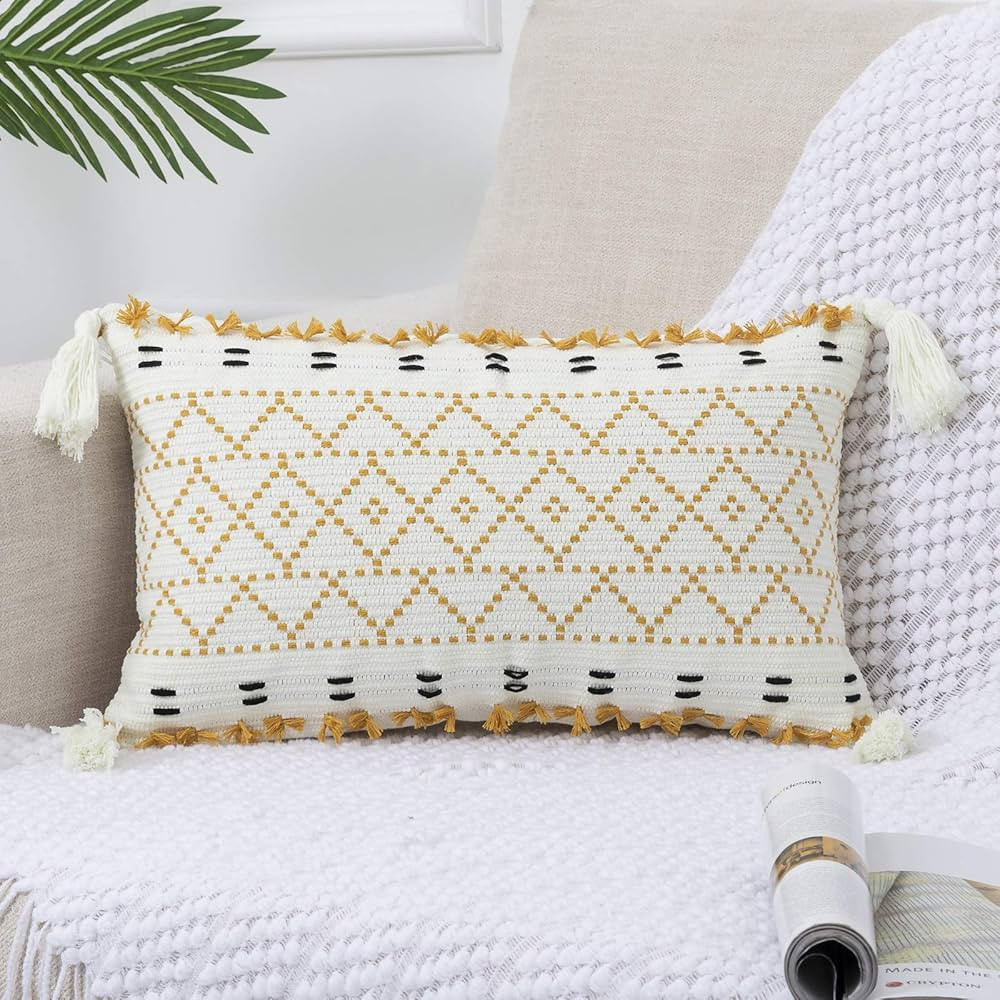PANOD Knitted Boho Throw Pillow Covers,Natural Cotton Hand-Woven Tufted Decorative Tassel Hug Lum...