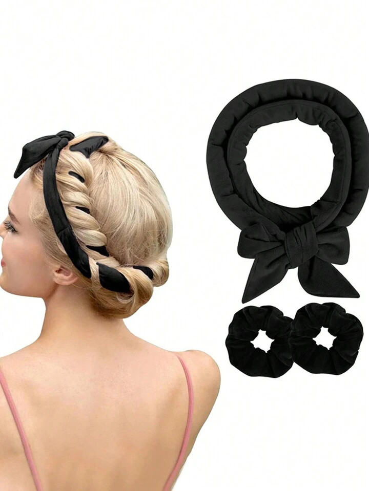 3pcs/Set Women's Black Bow Knot Slouchy Heatless Hair Curler, Sleep Hair Roller, Hair Band, Large...