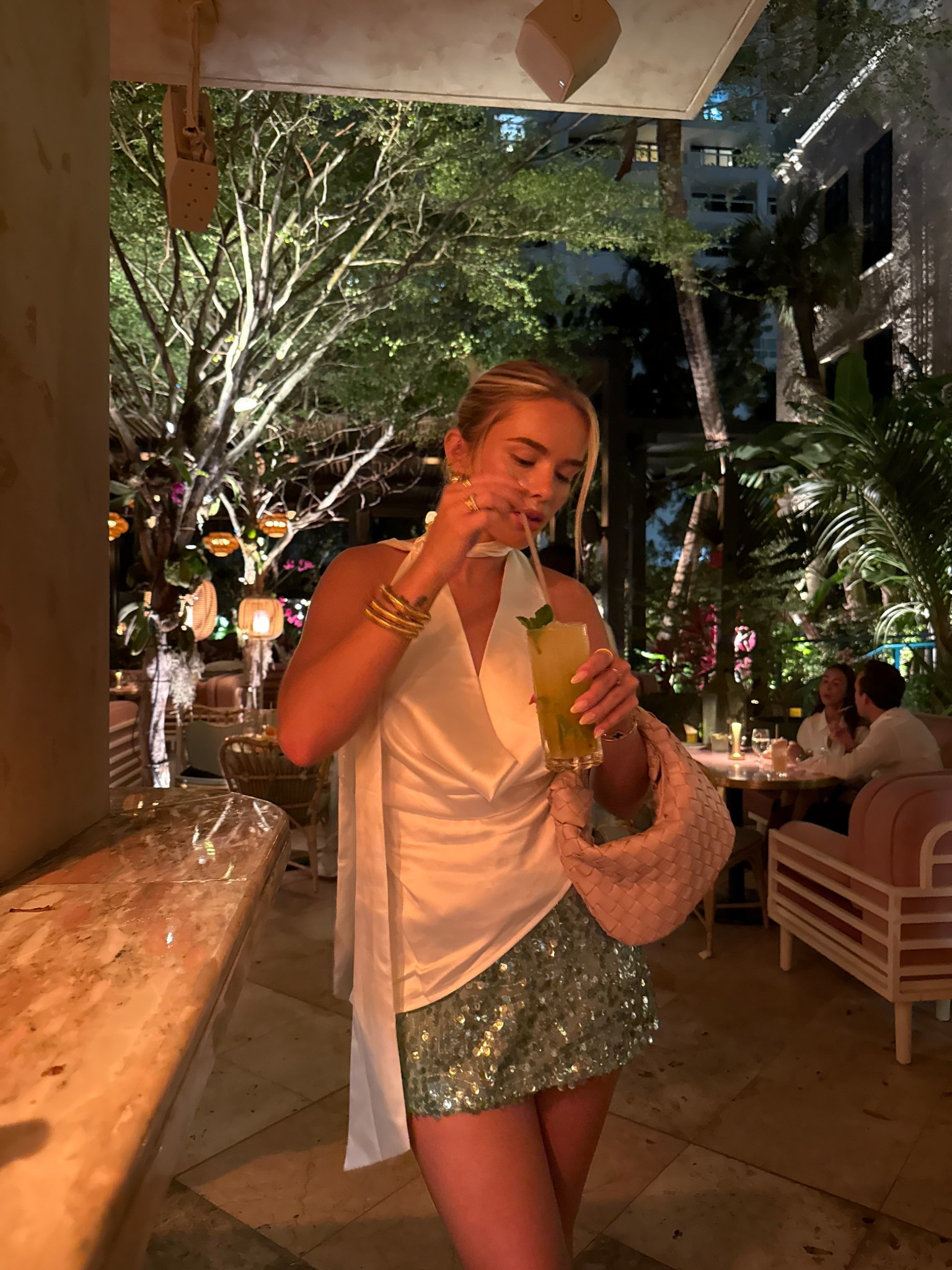 Spring Outfit Idea, Night Out Outfit, Bandeau Top, Pink Jeans, PLT, Heels in White, Bottega Bag