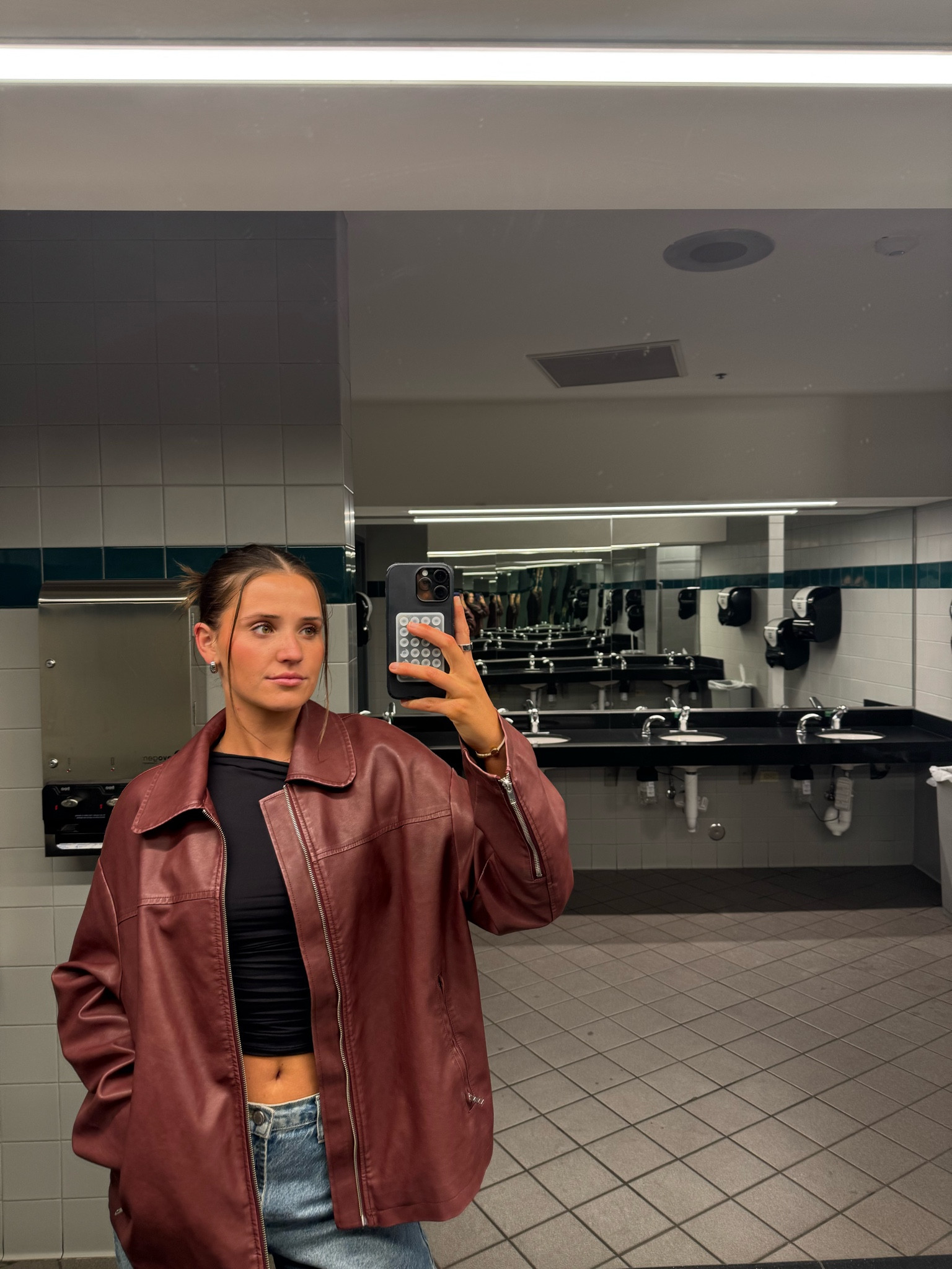 Wearing a 27L in the jeans in a medium wash! Size L in the jacket for an oversized fit!