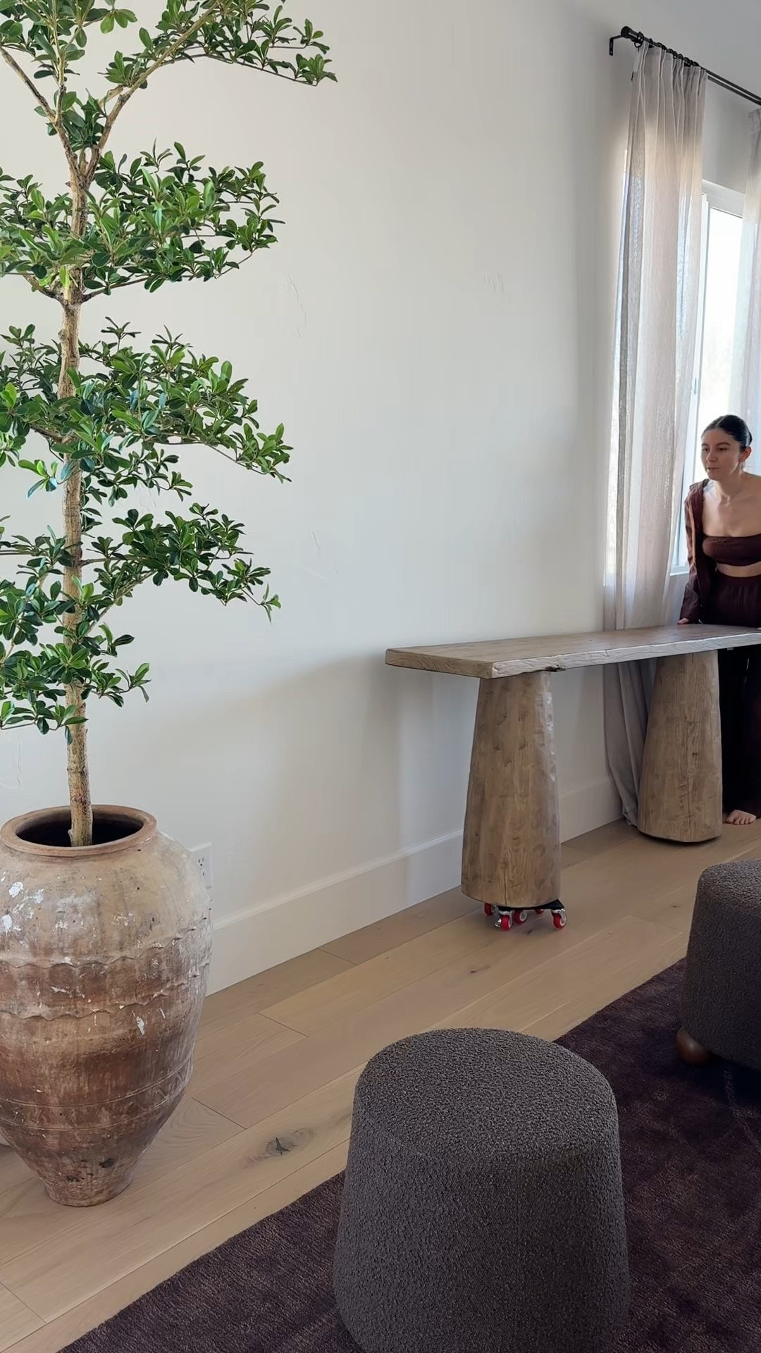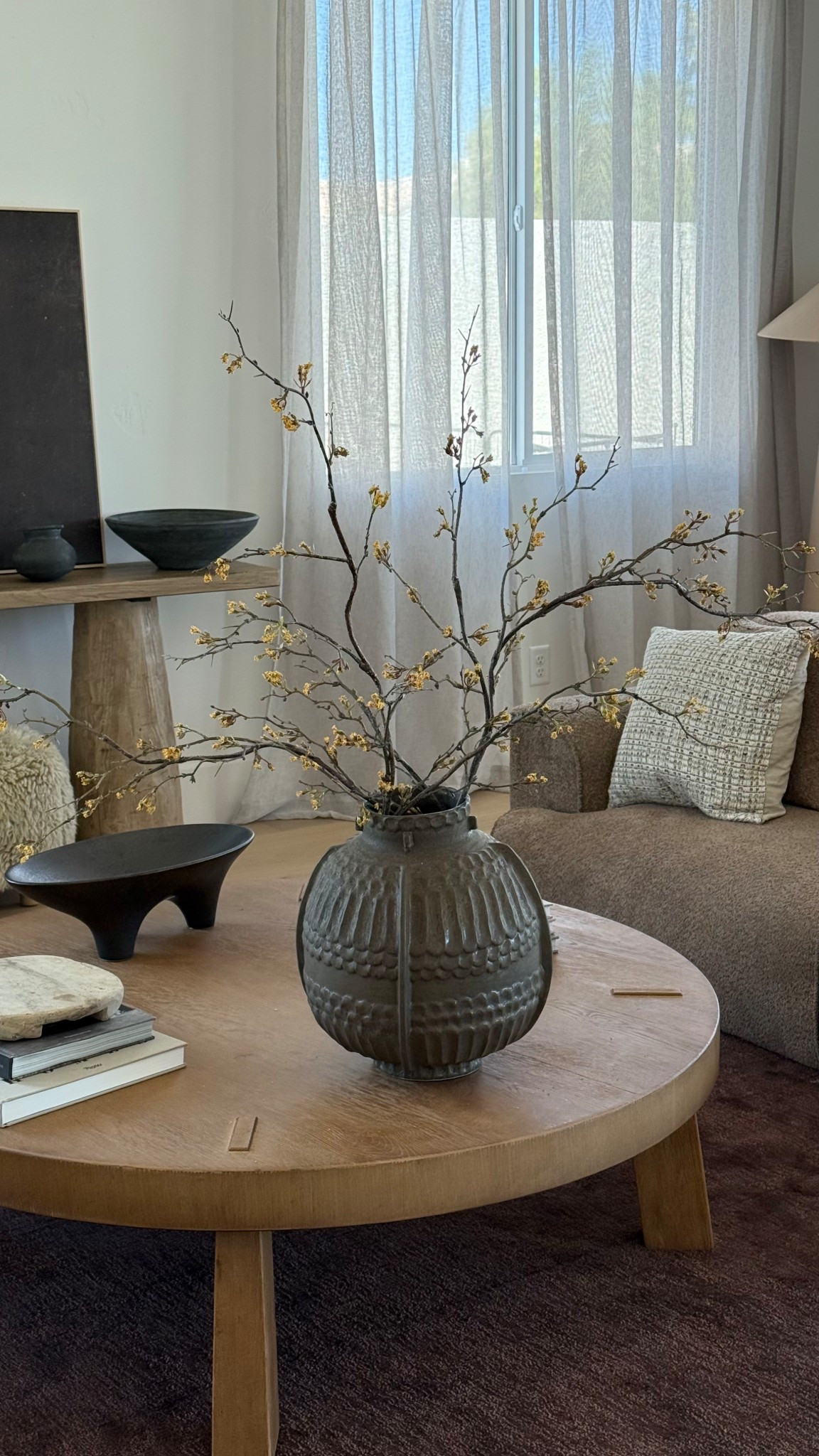 Neutral sitting room with reclaimed wood and olive jar. Warm tones and organic textures