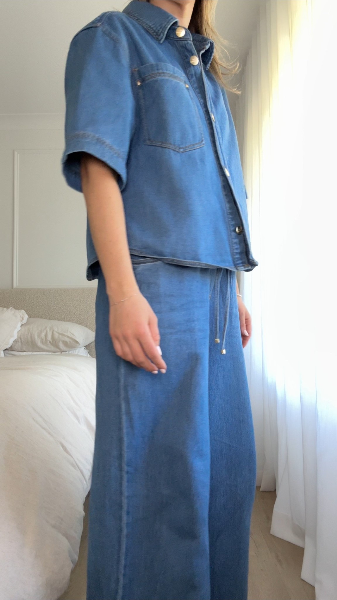 Wearing an 8 in both top and pants, should’ve sized down in pants as they’re linen!