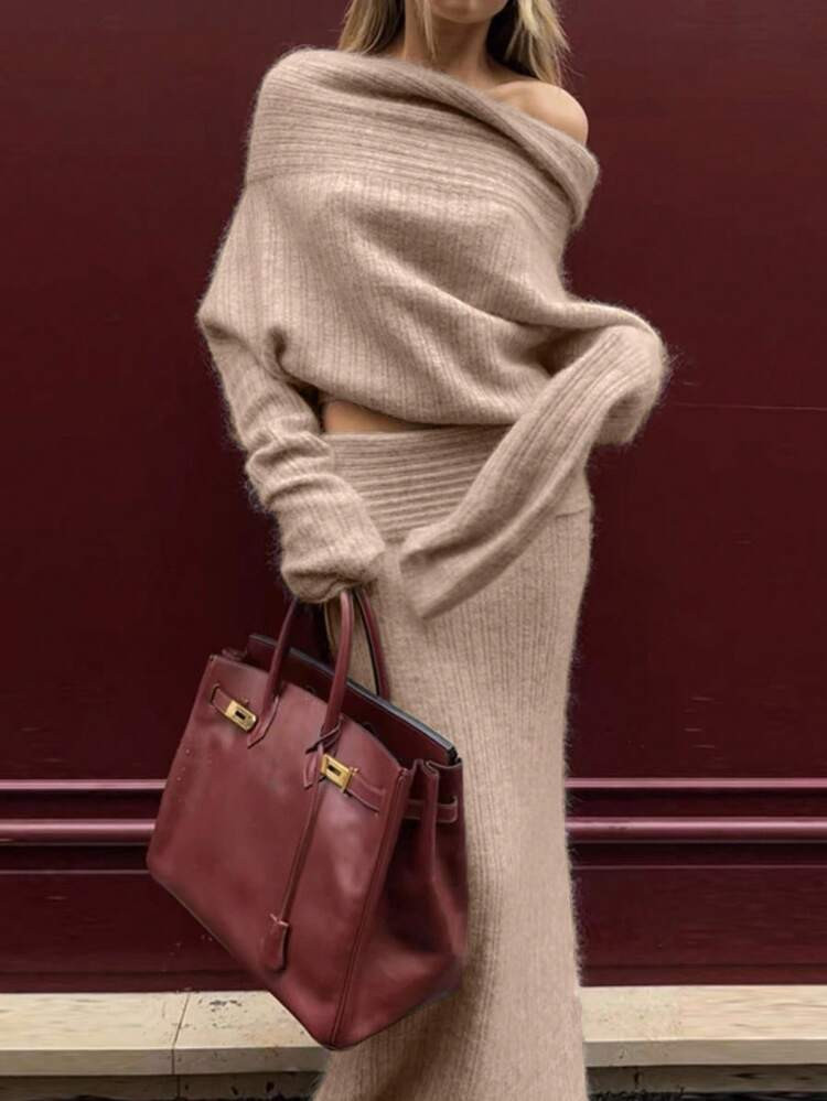 SHEIN Women's Elegant Solid Color Knitted Sweater And Skirt 2 Pieces Set