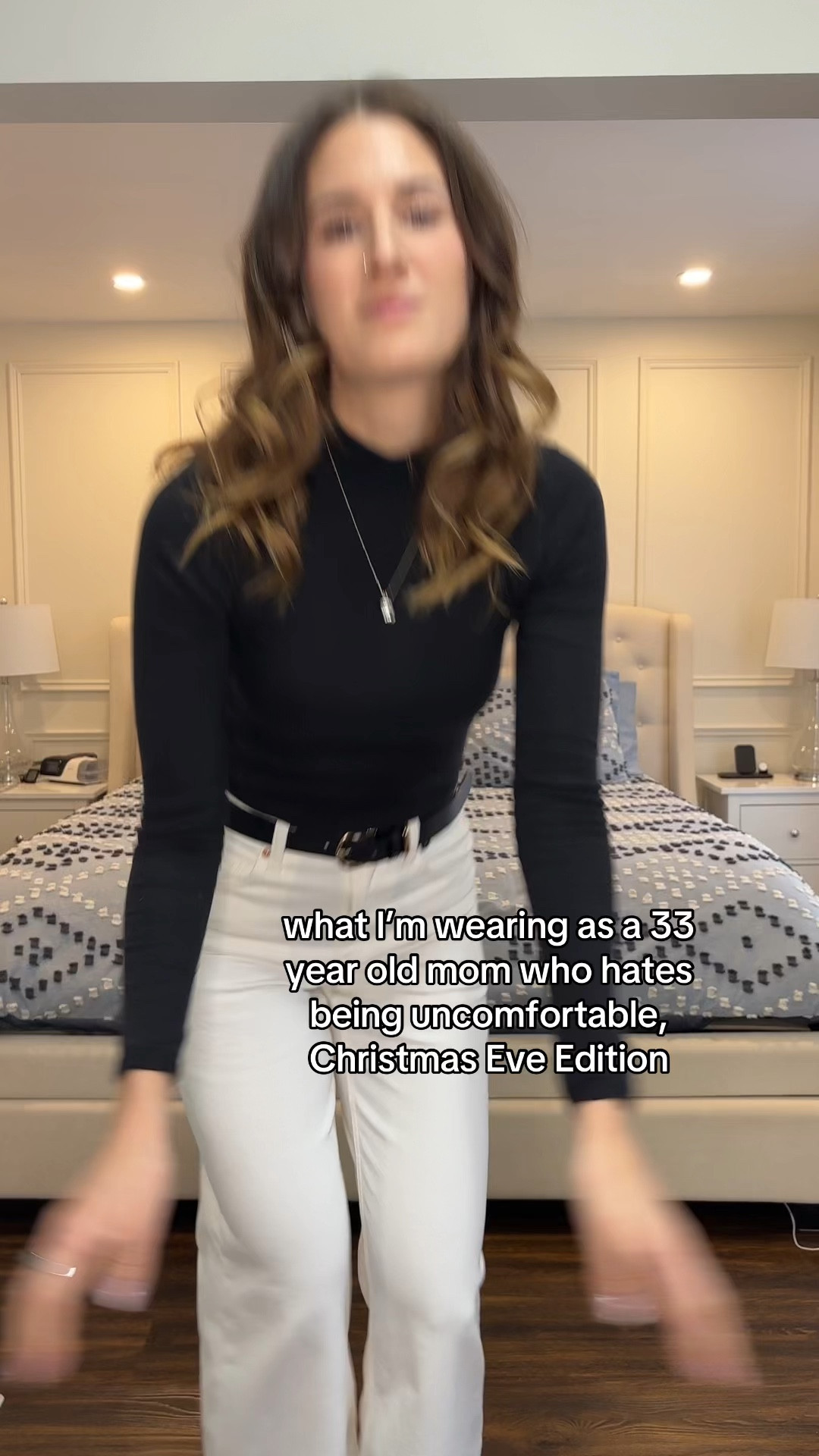 Wearing size medium in the sweater and 25 long in the jeans! (Sized down 2 sizes for a more fitted look)
