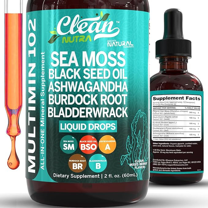 Clean Nutra Organic Sea Moss Drops Supplement | Black Seed Oil Irish Seamoss Ashwagandha Burdock ...