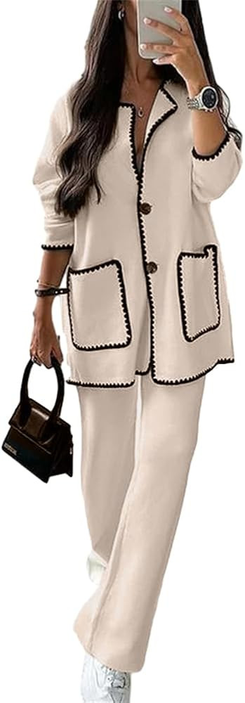 HOULENGS Women's 2 Piece Outfits Button Down Contrast Cardigan Sets Wide Leg Long Pants Lounge Se...