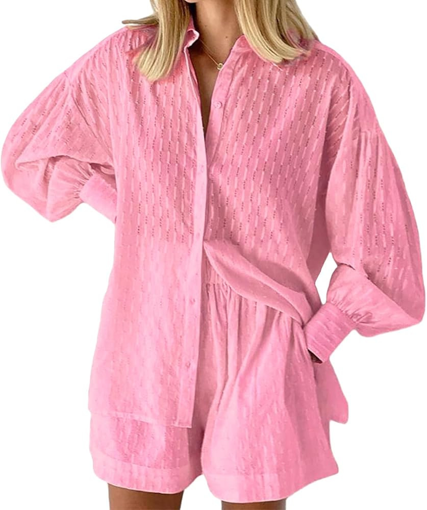 KYLASIEN 2 Piece Outfits For Women Casual Long Sleeve Hollow Out Button Down Shirts High Waisted ...